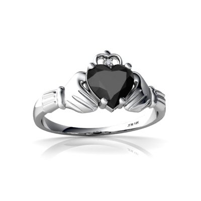 Nothing says I love you more profoundly than a Celtic Claddagh ring. Since ancient times, Claddagh jewelry has been given as a token of love, friendship, or as engagement rings to loved ones. In this ring, the 6 mm heart cut gemstone represents love, while the hands holding the heart represent everlasting friendship. We've added an accent diamond on the top of the heart, to make this even more of a special and significant gift that will show the receiver your infinite love.This celtic claddagh ring features a 6mm heart-cut black onyx center stone, accented by 1 sparkling diamond. The total gem weight for the ring is 1 carats, set in solid 14k gold. The band is 3/8 of an inch at its widest point tapering down to 1/16 of an inch at the back, and is 1/8 of an inch high off the finger.